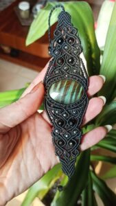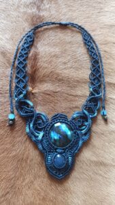 This statement necklace features a natural labradorite stone with mesmerizing blue flashes, handwoven with intricate macramé craftsmanship by the talented girls of the Hersand Record community.